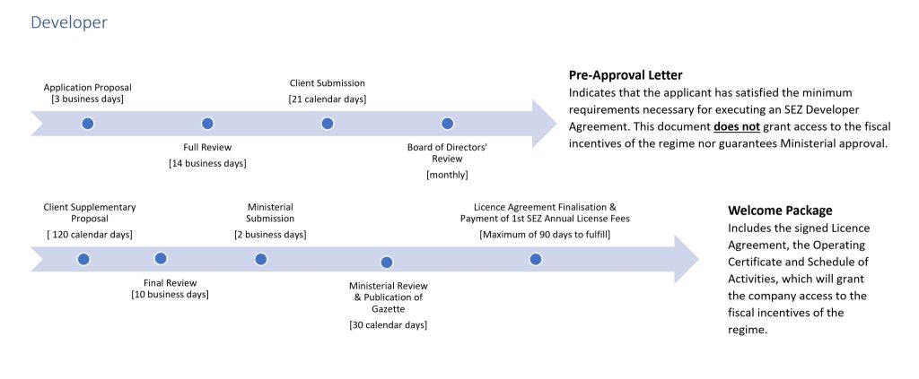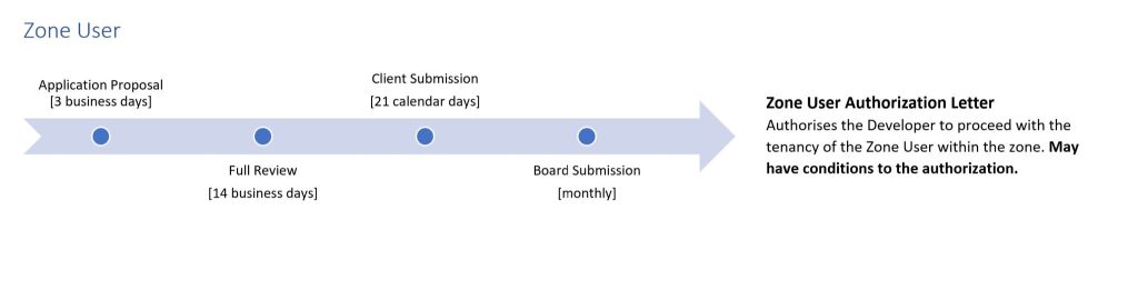 The Special Economic Zone (SEZ) status being applied for is the primary determinant of the SEZ application process and the respective timelines. Timelines for receiving your SEZ designation rely heavily on the quality and/ correctness of the documents submitted to support your SEZ application. To that end, the submission of accurate and current documents is crucial in completing the application process within the timelines provided. Please feel free to request a consultation with the Business Development Team to learn more.